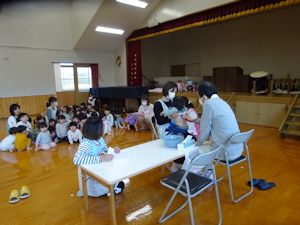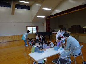 もも組さんから順番にすみれ組まであざかみ先生から聴診器をあてていただきました。